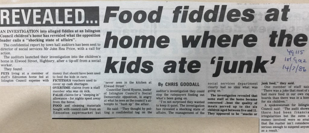ISN have frequently heard that food in the homes was minimal and children were denied food as a punishment. In some homes kitchens and food cupboards were locked and there were incidents where hungry children broke into them in order to be fed. There are accounts of children being arrested for stealing very small amounts of food when hungry. When stealing bread from a college kitchen, one of the college staff let some children have it realising they were hungry. This Islington Gazette record concerns Elwood Street.