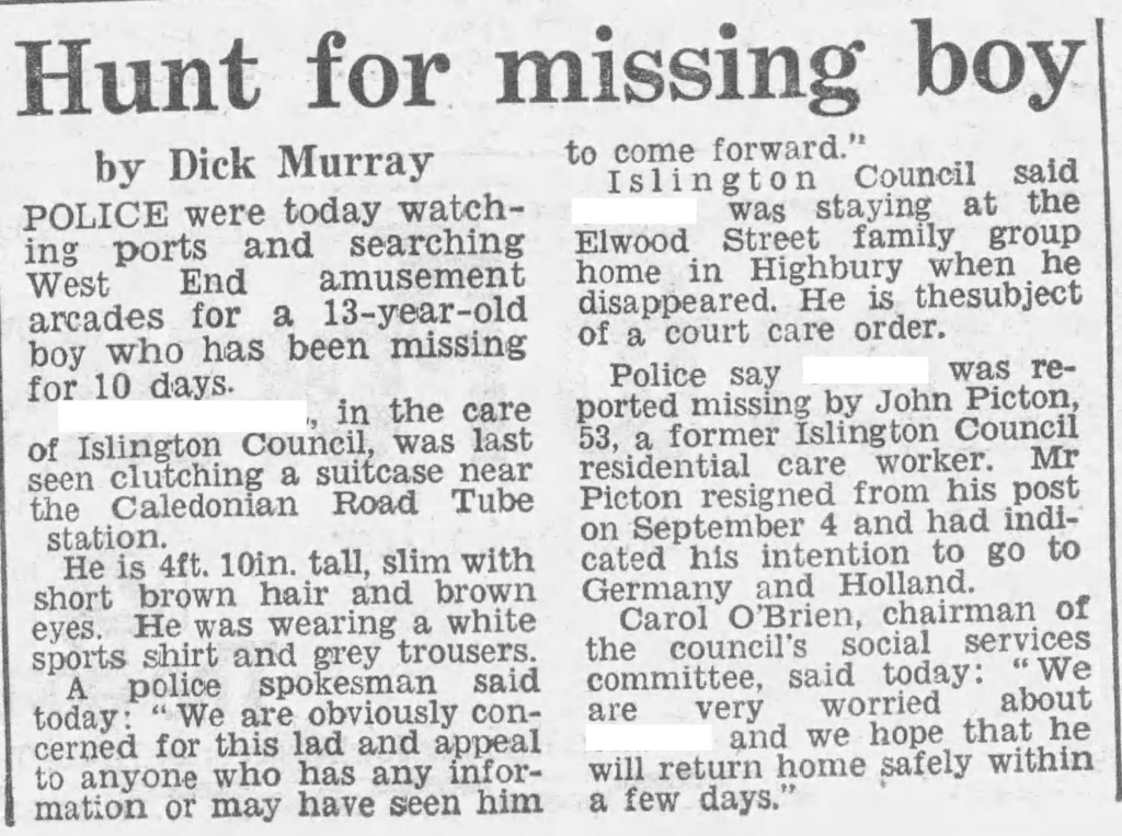 John Picton as a care officer met a boy in Conewood Street assessment centre but kept in contact with him at Elwood Street in 1983. The boy was found 2 months later in France and returned to the UK.