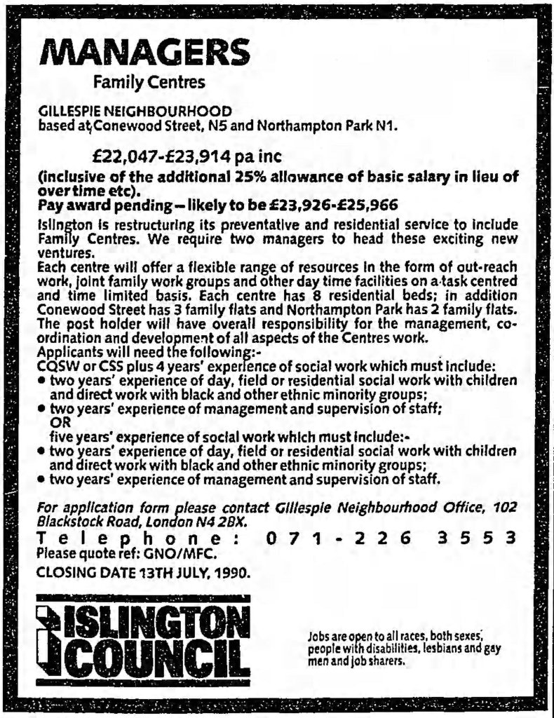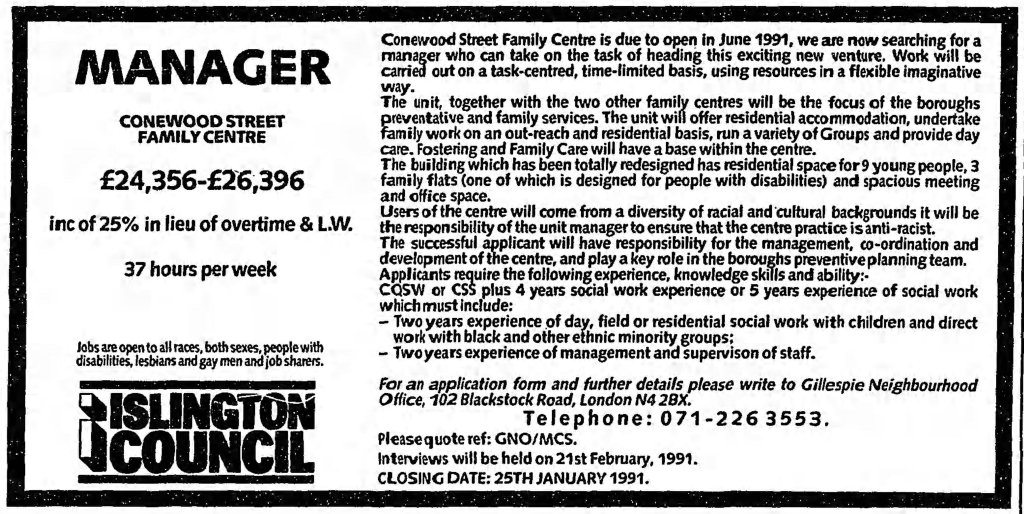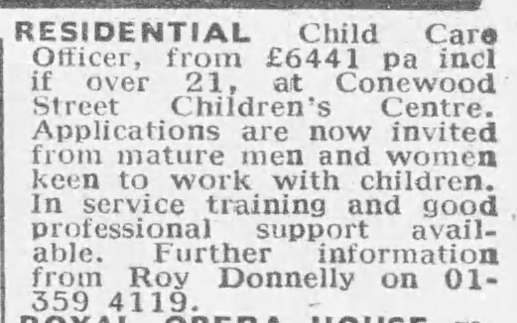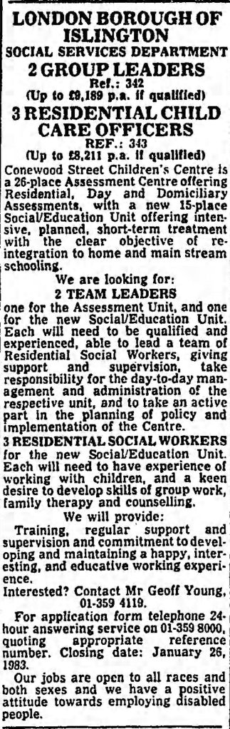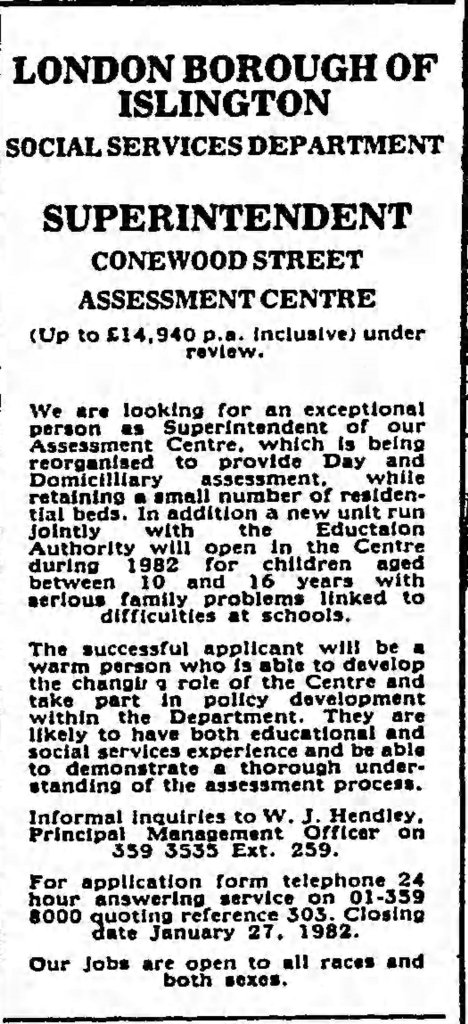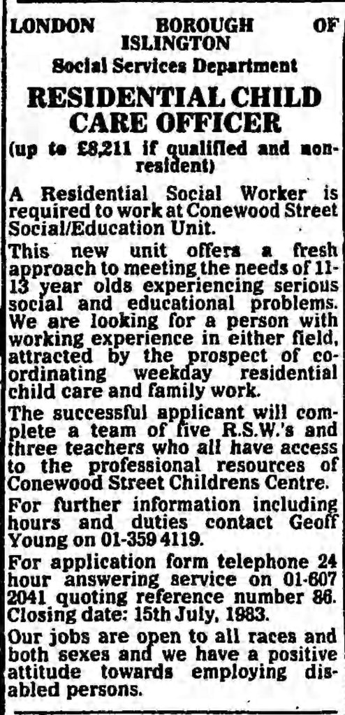 In 1981, Conewood Street children’s home staff were on strike and one survivor explained that children had to stay at the homes of residential workers. More on Industrial Action at islington children’s homes here.