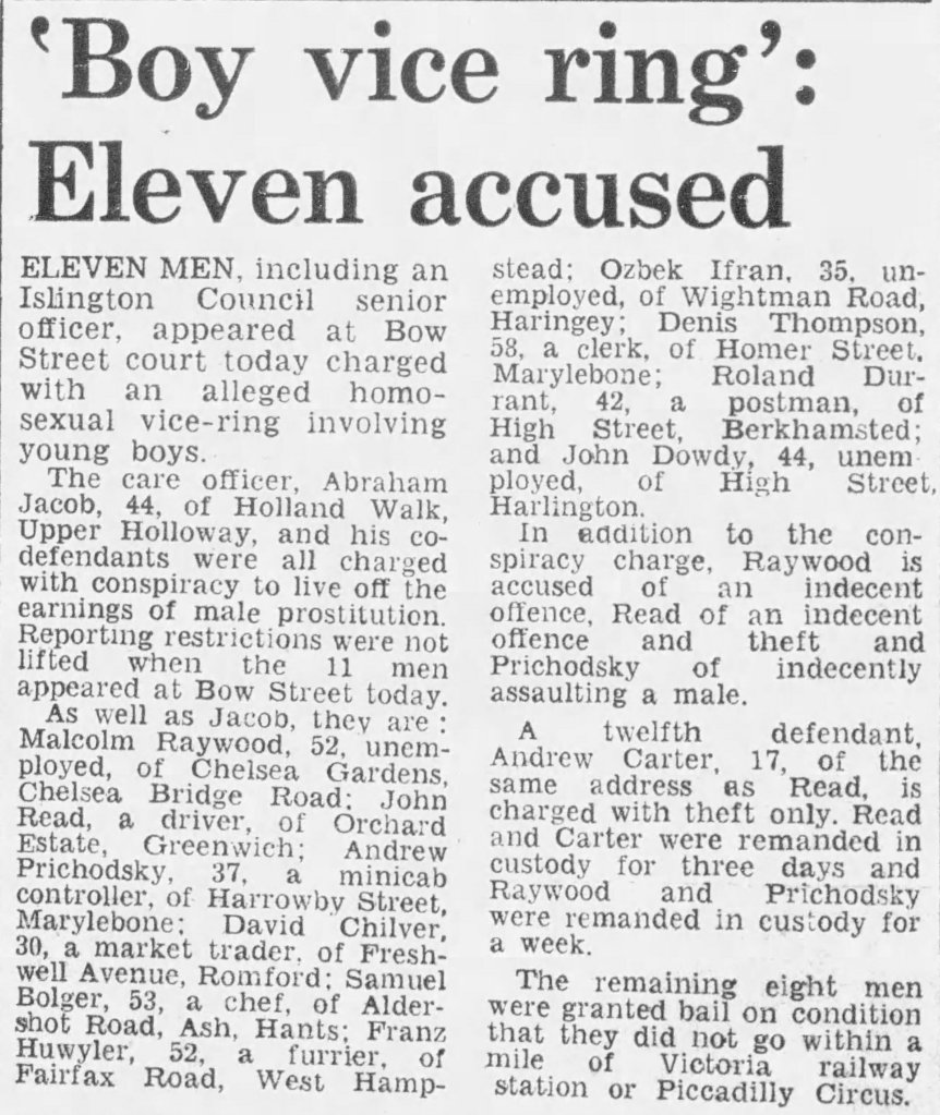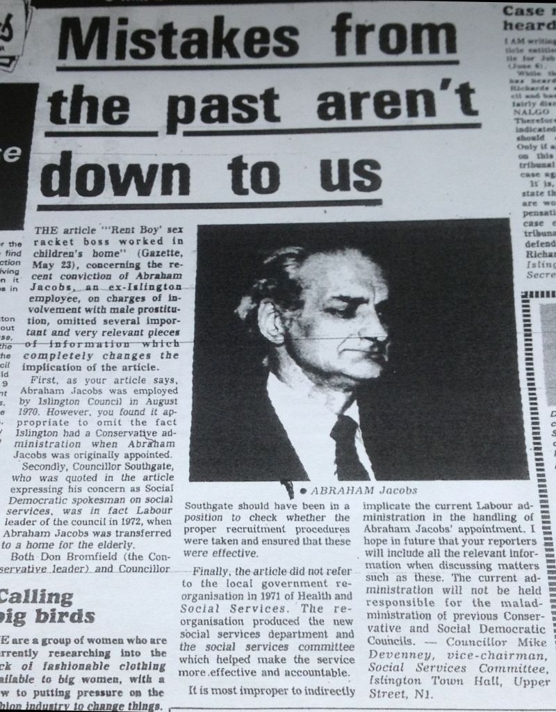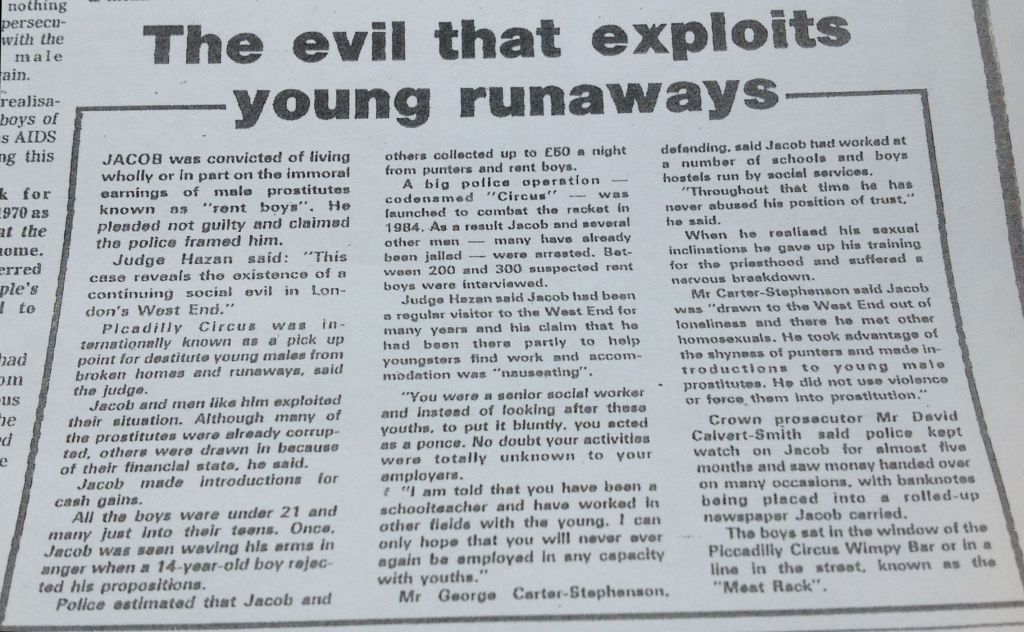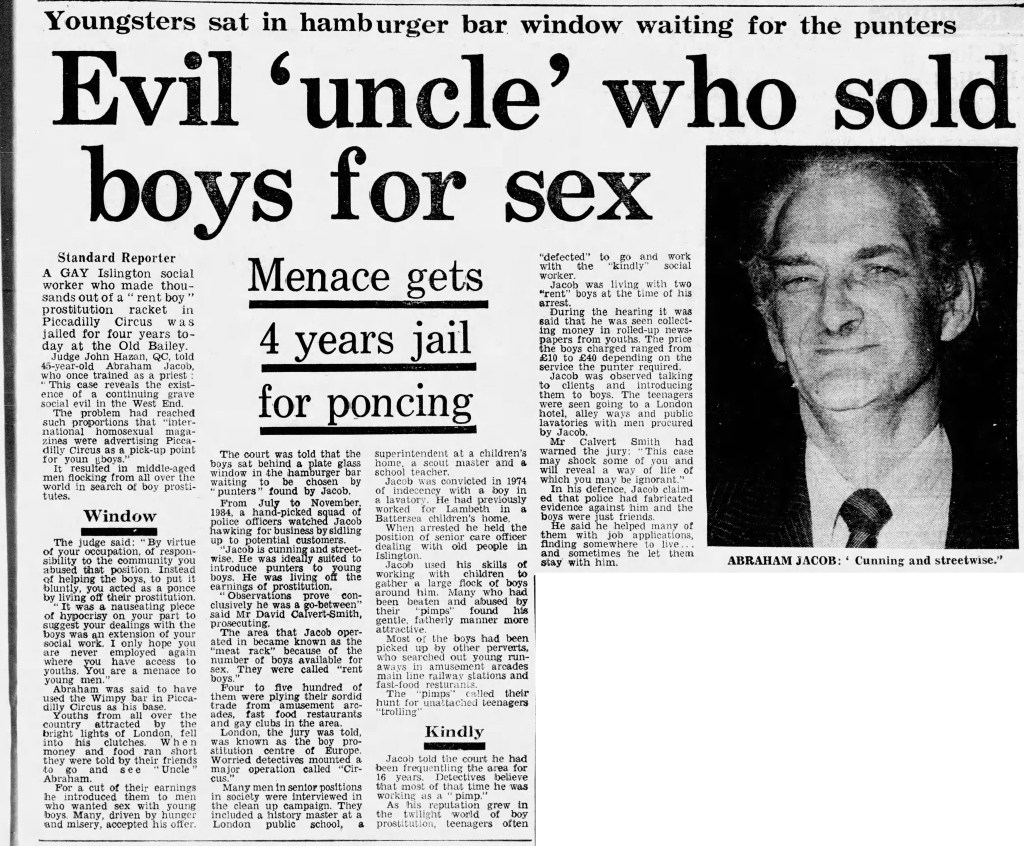 Jacob was a houseparent at 75a Mildmay Park children’s home, between 1970 and 1972 and later worked for Islington caring for older people. In 1986, he was imprisoned for 4 years for running a network of child sexual exploitation in Piccadilly Circus. The Judge said Jacob’s employers did not know about his activities. He had previously worked for Lambeth council. He lived at Holland Walk, Upper Holloway. He was a former schoolteacher and priest. He was arrested as one of 40 men under Operation Circus.