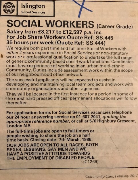 The Job advertisement 1986 Liz applied for as a basic grade social worker in Rosedale Neighbourhood office. She later was appointed as a senior social worker in 3 other neighbourhood offices.