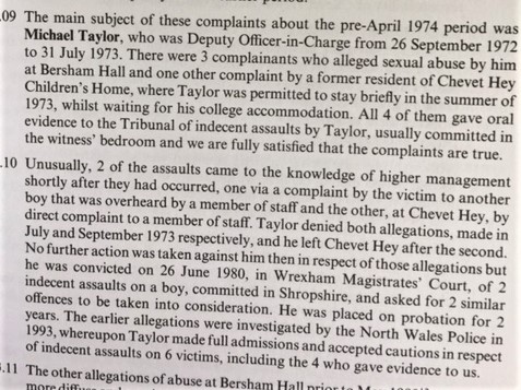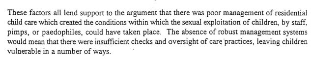 The Report of the Inquiry into the Management of Child Care in the London Borough of Islington – commonly referred to as the White Report (1995:p3) included a quote from the Evening Standard dossier presented to the Inquiry, police and Department of Health (this dossier has disappeared), ‘Over many years and at practically every children’s home, children have alleged abuse by named workers, often staff shared their fears that management has been slow to investigate, sometimes refused to involve police and suspected staff mostly quietly resigned even when they apparantly admitted the abuse’ .