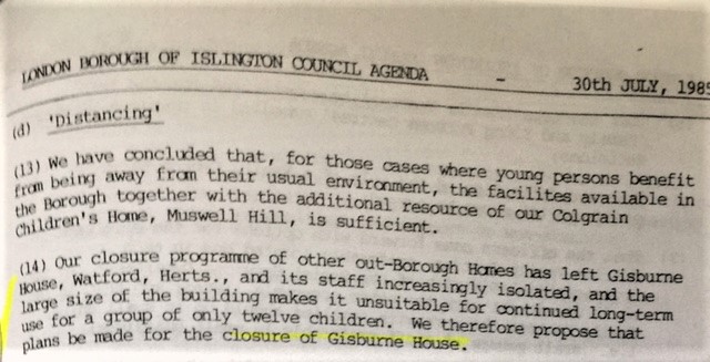 In 1985, a council meeting decided to bring Islington children back from the Home Counties into new children’s homes within the Borough and the decision was made to close Gisburne House as it had only 12 children there. This decision was not implemented as children continued to be placed there in order to reach the council target of 148 children’s LBI residential care placements. It was finally demolished in 1996.