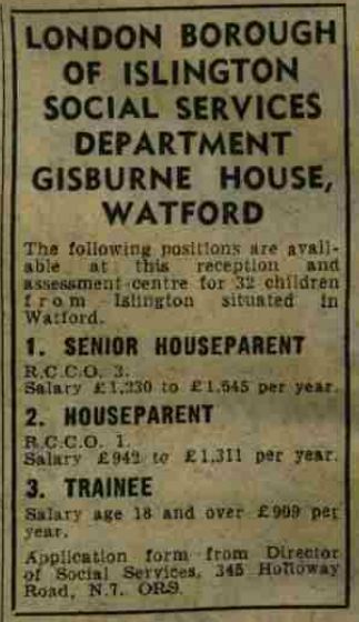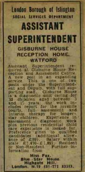 An advertisement in New Society (1971 Vol 18 p 206) described Gisburne House as a ‘Special Reception Centre’ and ‘Group One Community Home’ with 32 places.