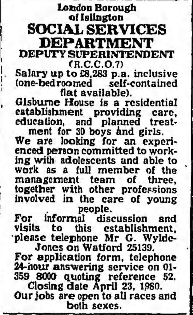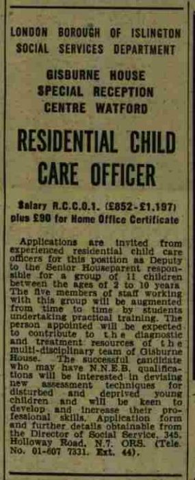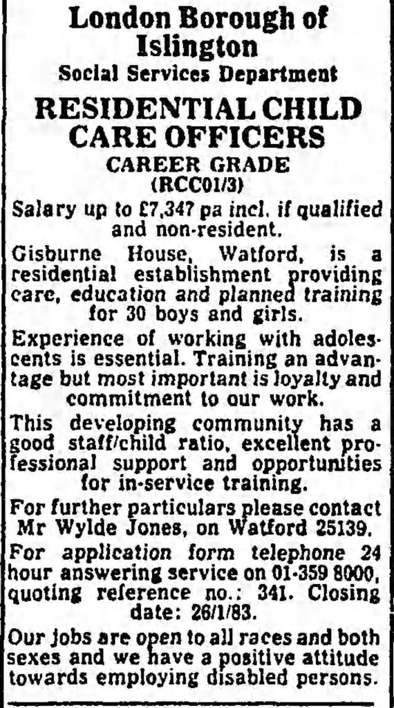 1983 an Islington recruitment advertisement described Gisburne as a ‘residential establishment providing care, education and planned training for 30 boys and girls.’ A file entry in 1983 stated that 26 children were resident and there were vacancies (Islington Survivor file).