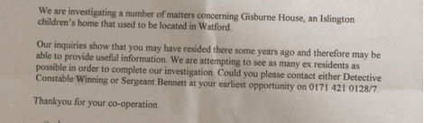 Police have told ISN to ‘bring them a victim’ or ‘ring in to the 101 police hotline’. Proactive intelligence led policing, multi agency strategy meetings and joint investigation with social workers, are multi agency protocols of the past eradicated from statutory guidance since 2013. Police will currently only investigate when a victim comes forward. Islington Survivors Network would not generally recommend calling through to 101 about something so complex (and some survivors do not have computers or the means to complete a form online) – ISN needs police officers we know we can trust, who we can recommend and who will treat survivors sensitively. The Gisburne children, now adults, must be in safe hands though the process of re-living and re-stating their evidence.
