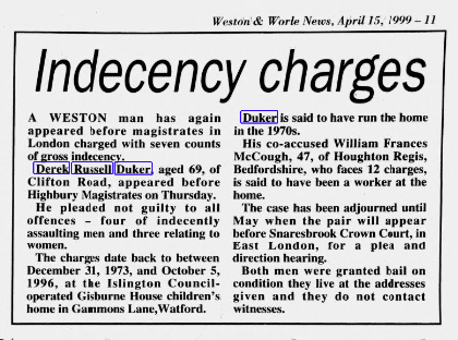 One of those managers charged but not convicted and not ever on trial was Derek Russell Duker (1929-2005) who is now deceased. Over 16 survivors remember him in Gisburne between 1969-76. However ISN now know that he stayed in contact with one boy until 1983 even though he had left the job. His contact with the boy was facilitated for some years at Islington Park Street the Social Services HQ. After he left Islington he lived in Clifton Rd, Weston Super Mer as was detailed in a letter he wrote to the Mirror in 1989.
