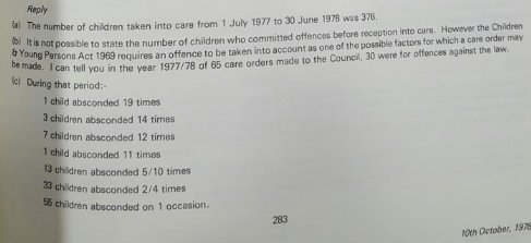 The above minutes record the number of children taken into care in 1978 as 376. The numbers who ran away is significant and supports survivor evidence of them running to escape abuse.
