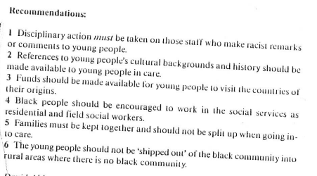 The Black and In Care conference 1984 (see this link for more information about this conference) made the recommendations listed below. Young people from Islington children’s homes played a key role in that conference but their views went unheard.