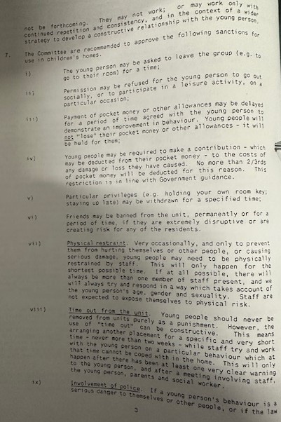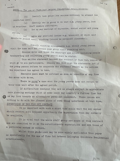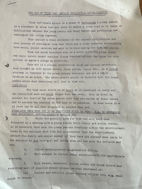 TIME OUT is often cited on files as a reason to move a child from one home to another following an incident and then they could remain in another home without returning to the home they had been in. This could be used when a child was disclosing abuse in one home to move them to another quickly to disorientate and confuse them.