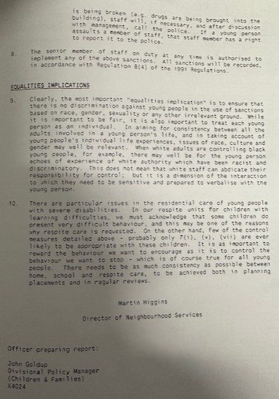 Very little documentation is available other than the council minutes of 1986 which cite 50% of children in residential care as being of ‘black and other ethnic minority origin’. It is unlikely that this statistic includes foster care but it states that only 25% of ‘officer staff’ are from similar backgrounds. It is unclear who are ‘officer staff’. Survivors have consistently spoken to ISN about racism in all settings and their comments are included where they belong in the named homes and in foster placements.