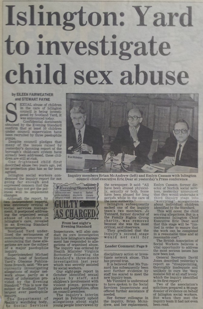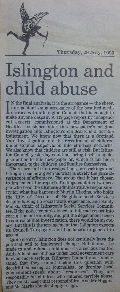 ‘Islington: Yard to investigate sex abuse’ Evening Standard, 29th July 1993 Share this: Click to share on X (Opens in new window) X Click to share on Facebook (Opens in new window) Facebook Click to share on Reddit (Opens in new window) Reddit Click to share on Pinterest (Opens in new window) Pinterest Click to share on WhatsApp (Opens in new window) WhatsApp Like Loading...