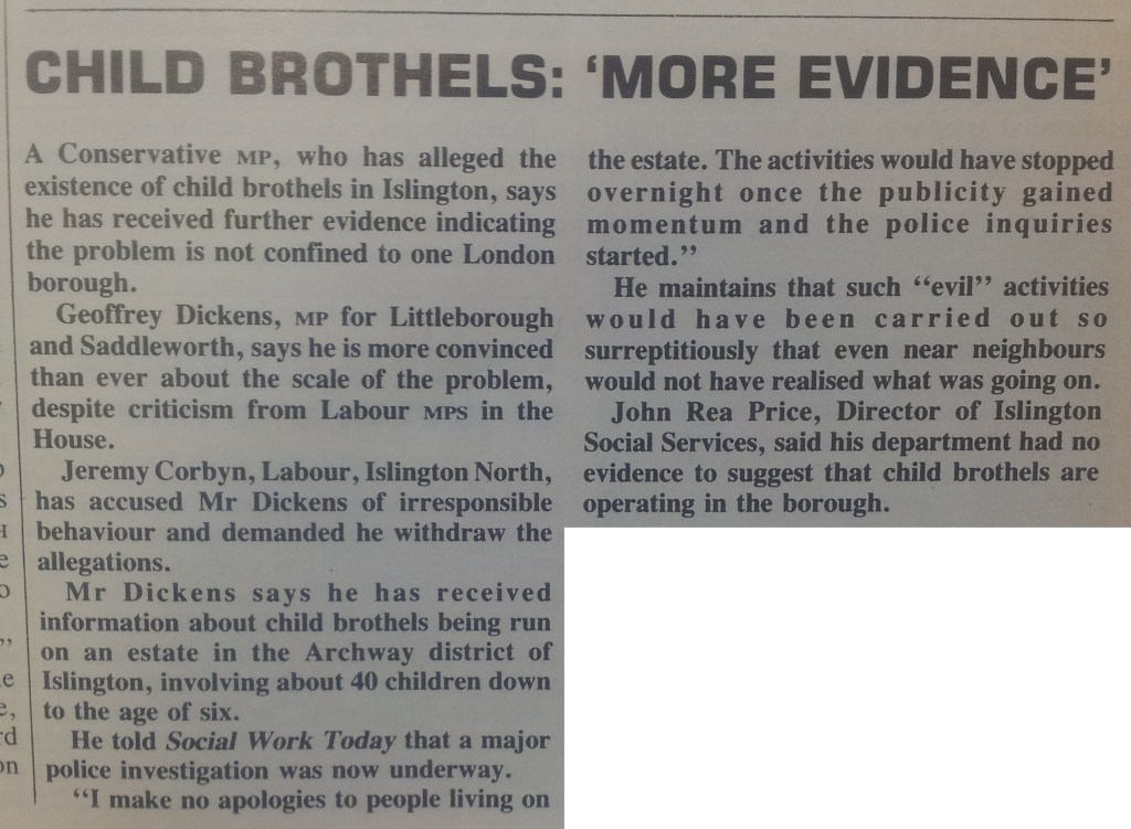 In 1986, Geoffrey Dickens MP said he had evidence that child brothels were being run on an estate in the Archway district of Islington, involving about 40 children down to the age of six. Jeremy Corbyn accused Dickens of irresponsible behaviour and demanded he withdraw the allegations.