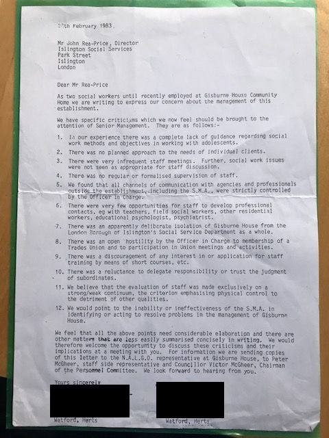 John Rea Price left Islington’s employment in 1990 following a disagreement over policy developments and began work at the National Children’s Bureau in April 1992 – before the Islington abuse scandal was exposed in October 1992. It is ISN’s understanding that he will not speak in public about any matters concerning his employment over 20 years in Islington and has not contributed to any of the local authority inquiries. It is also ISN’s understanding that a number of staff reported concerns to him and one such complaint from 1983 is listed below in relation to Gisburne House. The two staff who wrote it told ISN they had no response from the Director.