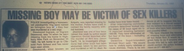 Now police working on Operation Orchid, set up in 1989 to look at the activities of the gang, are trying to trace four boys who went missing between 1983 and 1986. They are Michael Monaghan, aged 16, from Hayes, who vanished in 1984; Paul James, aged 16, missing from Brixton in 1984; Michael Maughan, aged eight, from Kentish Town, missing since 1985; and Desmond Ingram, aged 14, from Highbury New Park, who also vanished in 1985. Two other boys have been described only as Mark and Hussein.