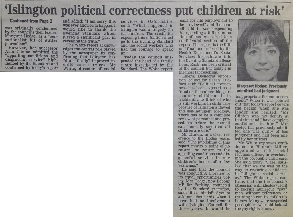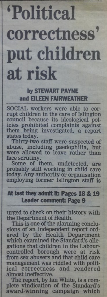 ‘Political correctness put children at risk’ Evening Standard, 23rd May 1995 Share this: Click to share on X (Opens in new window) X Click to share on Facebook (Opens in new window) Facebook Click to share on Reddit (Opens in new window) Reddit Click to share on Pinterest (Opens in new window) Pinterest Click to share on WhatsApp (Opens in new window) WhatsApp Like Loading...