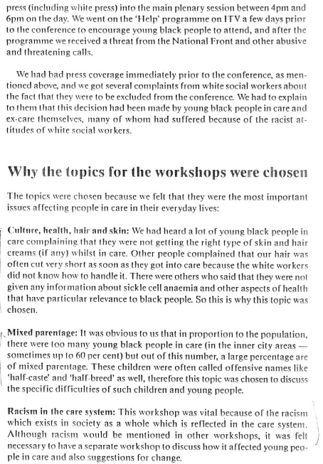In October 1984, a conference Black and In Care included contributions from children from Islington’s children’s homes. Organised by the voluntary sector, it highlighted the needs and experiences of black children in the care system. It is indicative of some positive initiatives at a time when ISN survivors speak of the many aspects of racism evident within childrens homes and foster placements. It is a measure of the fear of the consequences of disclosure that, even in this supportive setting, those children who attended did not speak to the organisers of the ongoing sexual and physical abuse they were experiencing.