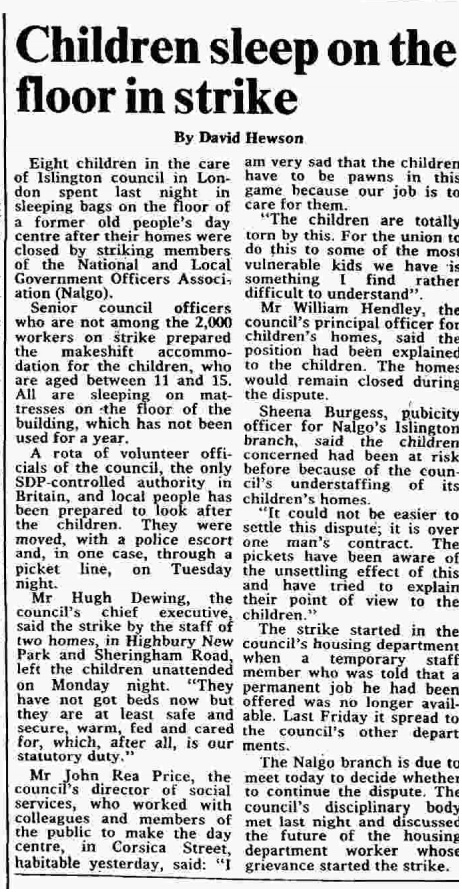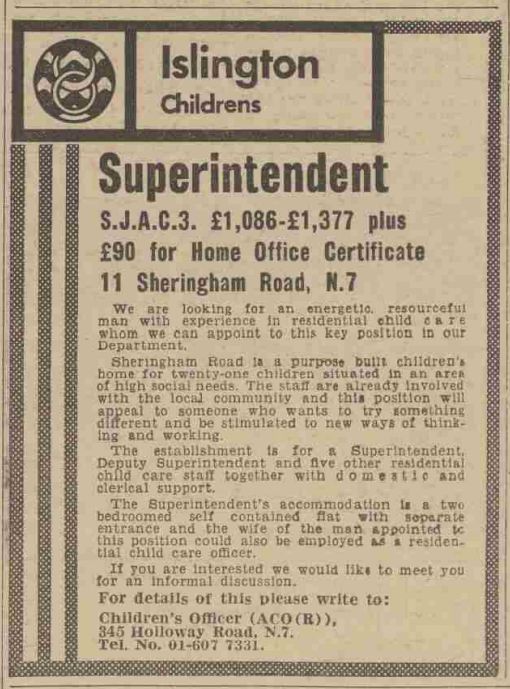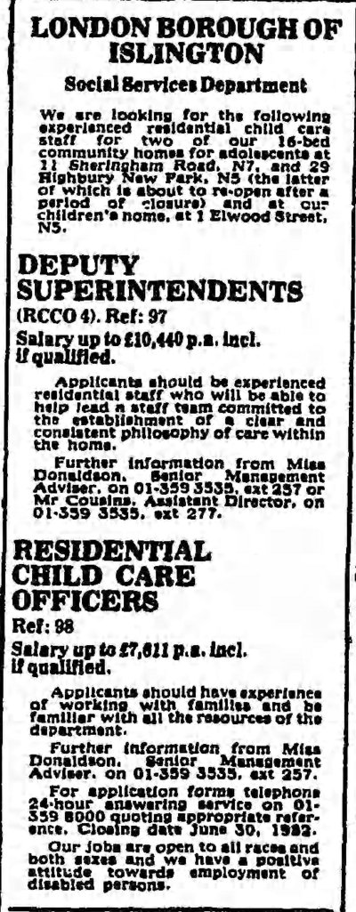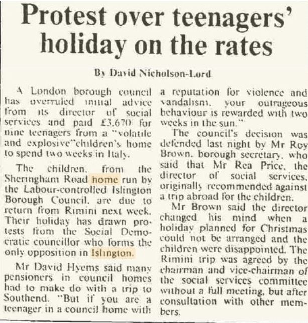 A survivor who was age 15 years said ‘ There was a strike in the 80s. Sheringham Road children were taken to Corsica Street. We were told at shift change at midday. It was an unused warehouse. The place looked like after a disaster. We were given beds and pillows and charity clothes.’ This article (Islington Gazette 26.2.82) describes it as a ‘ temporary childrens home in a former day centre’. More information on the Industrial Action page.