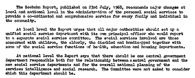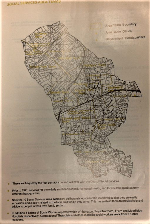 Following the Seebohm Report proposals (1968), which changed the national structure of social services from specialised teams based on children, mental health and welfare to generic social work, Islington developed Area Social Work Teams. Each area office would be providing all local authority fieldwork services to a defined geographic community.