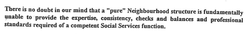 White concluded that ‘The policy of decentralisation based on Neighbourhood Offices from 1982 onwards combined with much changed personnel and equal opportunities policies, began to create an environment here the morale, management competencies and professional standards of the department declined. These problems were exacerbated by financial considerations, the way the departmental changes were imposed, the appointment of middle managers who were not qualified to manage social services practices, the poor quality of residential care management, the aftermath of lengthy industrial action and working relationships with other agencies which were not as good as they should have been.’