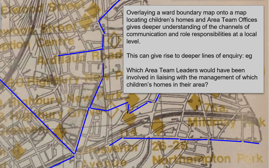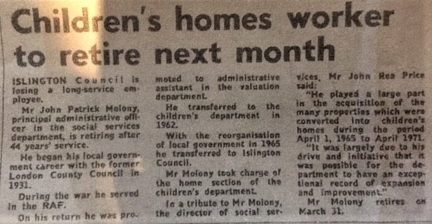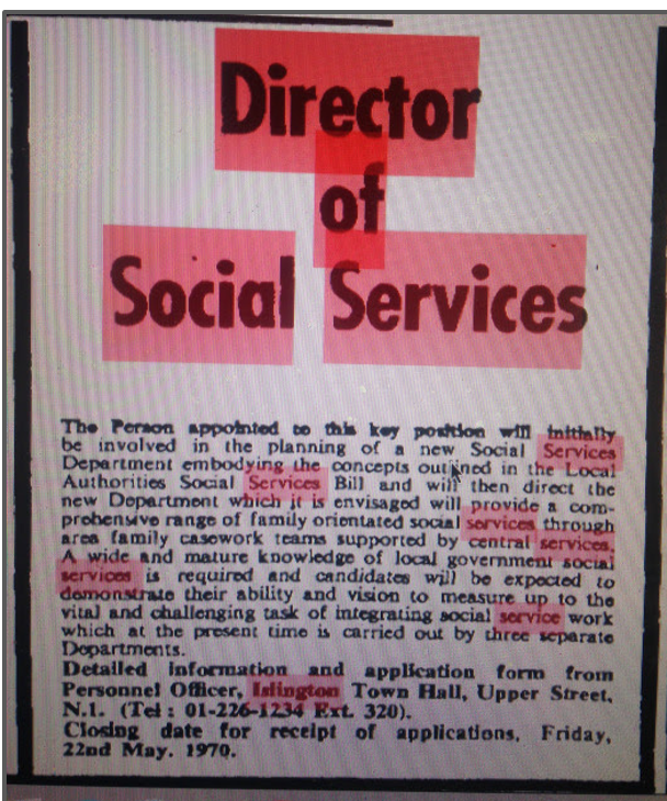 Previously the Children’s Department had operated from one central office and there were 7 areas each with its own senior Child Care Officer and team. This era also saw the new post of Director of Social Services in each local authority. and Social Services Committees. Hermas Rees-Jones was the first Director of Social Services who set up the structure for 10 area teams, located within their service areas (decentralised), with 8 – 14 mixed-discipline social workers in each. At this same time there was (following a Home Office report in 1970) a policy of moving children from children’s homes out of Borough to newbuilds or redeveloped homes within Islington. See ISN Report #10