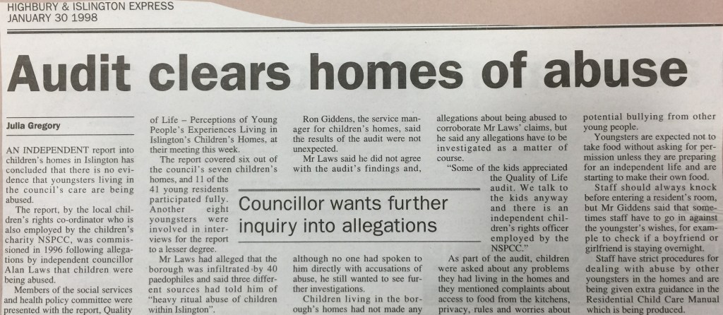 The Evening Standard published its first 8 page report on Islington’s children’s homes in October 1992 following a 3 month investigation. It was made possible by the courage of social work and police whistleblowers appalled by increasing evidence that Islington employed and protected network paedophiles in children’s homes. Police in 3 forces outside London – Sussex, West Mercia and Cambridgeshire investigating large scale child abuse networks, found they were closely linked to Islington but that the council repeatedly blocked their inquiries. Council leader Margaret Hodge resigned weeks after the Evening Standard exposed the scandal and Derek Sawyer took over as Council Leader.