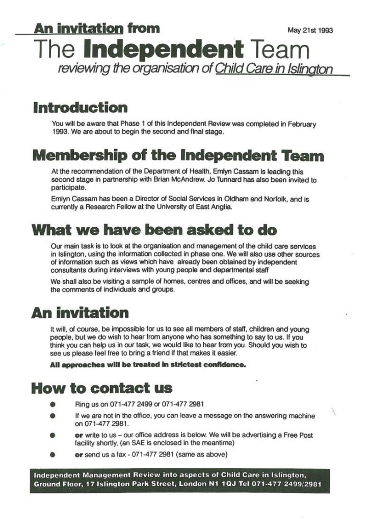 ‘In 1995 the Council received a report of an investigation by Ian White and Kate Hart –known as the White Report – into the council’s management of allegations of abuse of children in Islington’s care. This report is very much of its own time, and some of the language used is insensitive by today’s standards. The report was deeply critical of the council and led to profound changes in the council’s management of childrens’ services.‘ Richard Watts, Council Leader