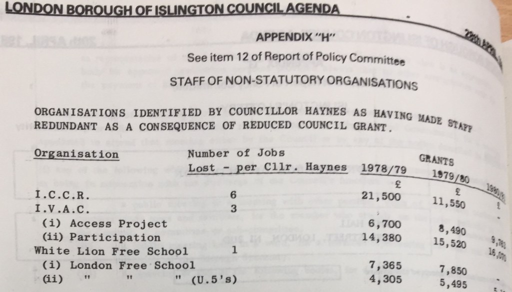Islington Council funding of White Lion school is listed for the years 1978-9 £7365 and 1979-80 £7850